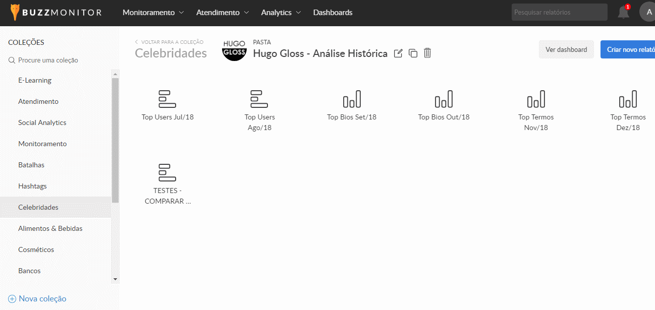 Por exemplo: você deseja comparar quais foram os principais termos citados nas redes sociais da sua marca em novembro e dezembro de 2018, as top bios nos meses de setembro e outubro de 2018 (lembrando que é possível monitorar bios apenas de Twitter e YouTube) e os principais usuários que interagiram com sua marca em julho e agosto do mesmo ano.