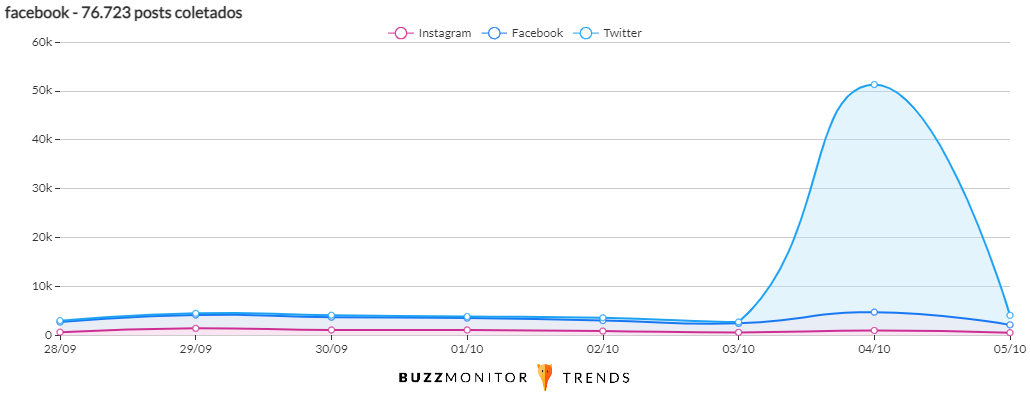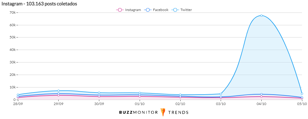 O concorrente do WhatsApp também teve um aumento repentino no buzz. Só em 04/10, foram 24.488 citações ao Telegram coletadas pelo Buzzmonitor Trends, o que representa 83,43% das menções de toda a semana.