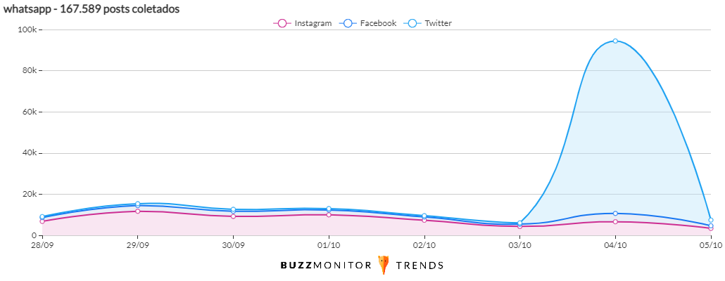 Para analisar o buzz sobre a queda, utilizamos o Buzzmonitor Trends, que mapeia o que dizem noticiosos e perfis de influenciadores em redes sociais. Em 04/10, foram 213.267 menções em português às redes sociais do Facebook (WhatsApp, Instagram e Facebook). No ranking das mais citadas, o WhatsApp está no topo, confirmando a importância do mensageiro entre os brasileiros.