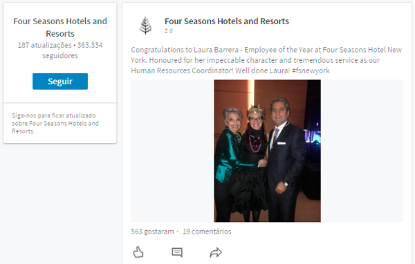 Já a página do Four Seasons faz a rede canadense de hotéis e resorts ser tanto o emprego que você gostaria de ter quanto o lugar onde você gostaria de se hospedar. O conteúdo varia entre divulgação de serviços e vagas de emprego a concursos bem-humorados com os seguidores.