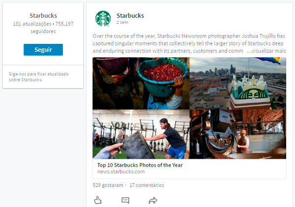 A Starbucks consegue variar o conteúdo na rede social mesmo sempre usando como gancho o café. São publicações sobre as melhores fotos do ano, depoimentos de colaboradores, dicas de organização, apresentação de novos funcionários e por aí vai.