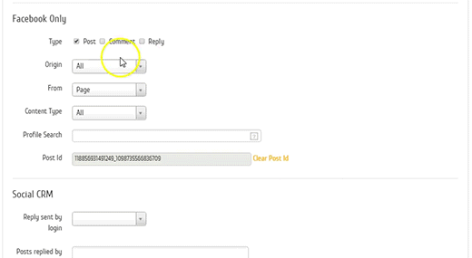 Depois, em “Facebook Only”, marque a caixa ao lado de Comments e em From selecione as opções User e Replies.