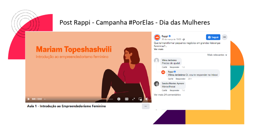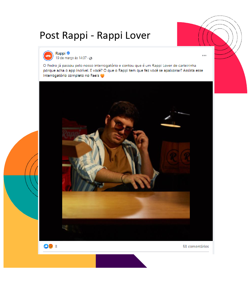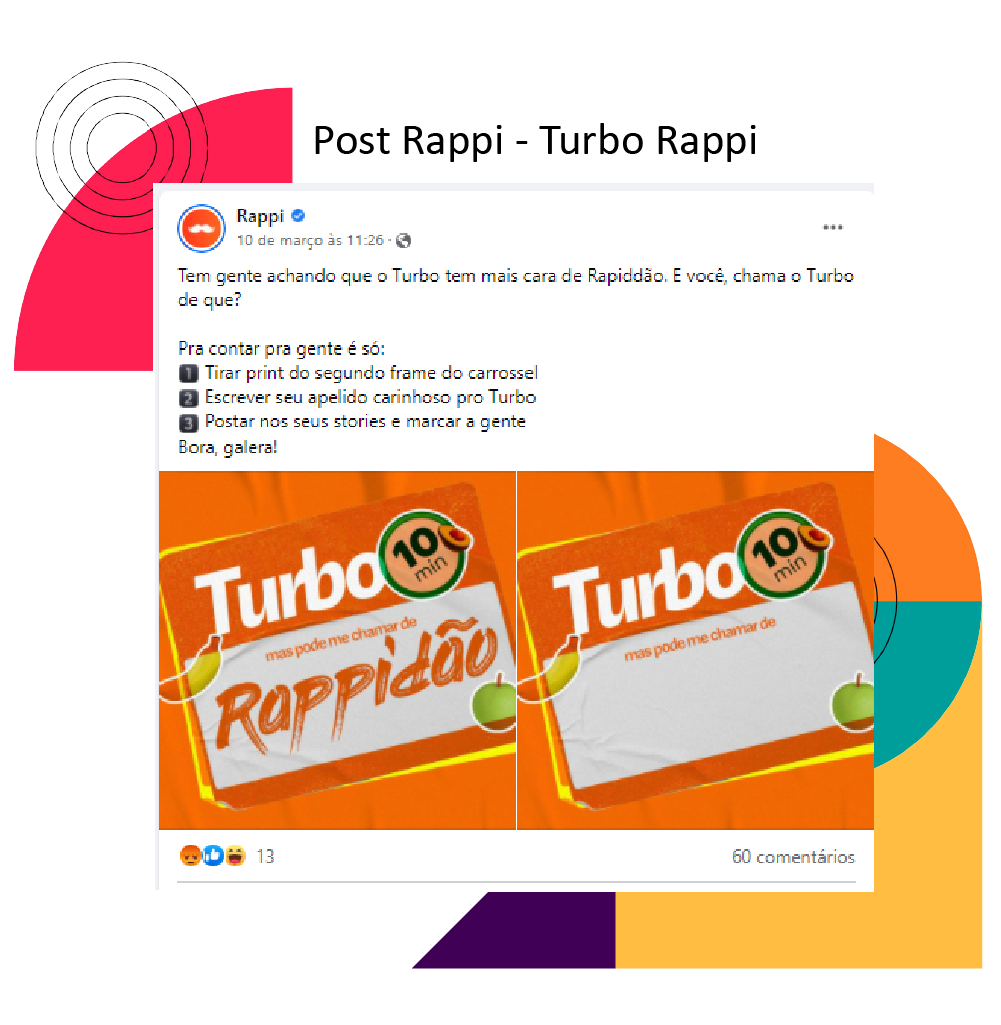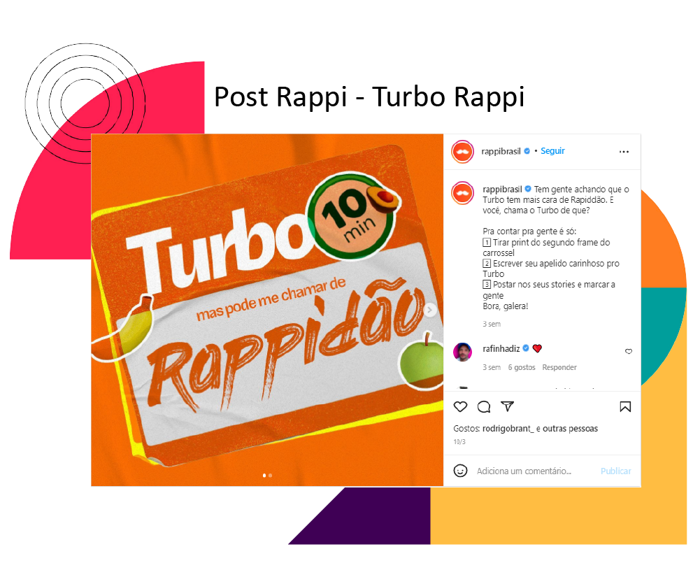 Na página da Rappi, o post com mais interação foi uma sugestão de apelido para o “Turbo Rappi”, modalidade de entrega em até 10 minutos. Em segundo lugar, um post da campanha Rappi Lover. E em terceiro uma publicação sobre a campanha #PorElas, que aborda empreendedorismo feminino, lançada em comemoração ao Dia Internacional da Mulher.