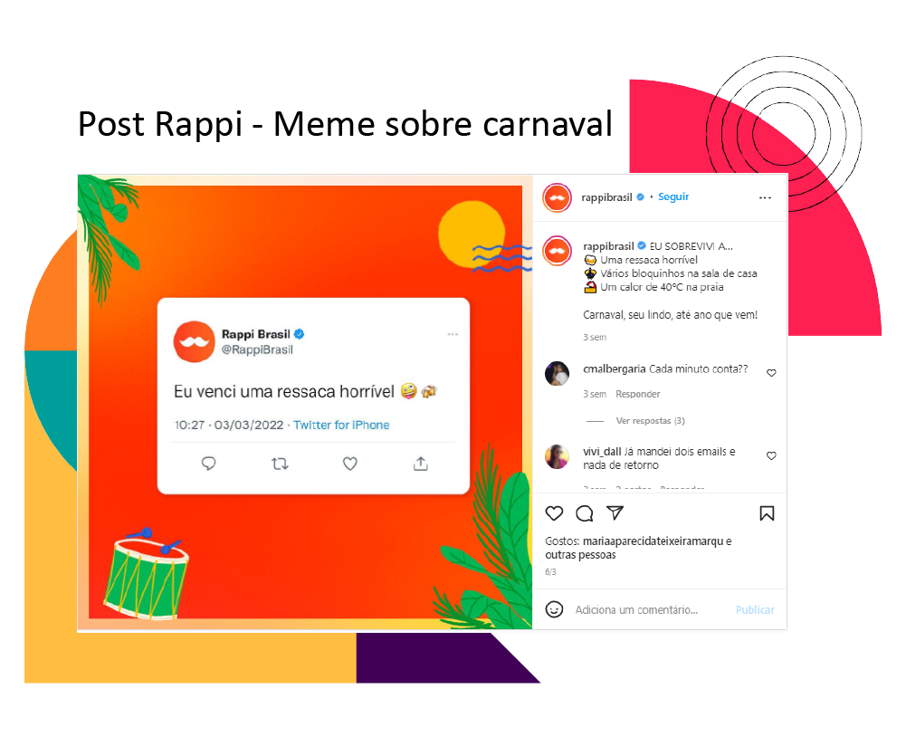 Já no Instagram da Rappi, os 3 top posts foram bem similares aos do Facebook. O 1º sobre sugestões de apelidos para a modalidade de entrega “Turbo Rappi”; o 2º um meme sobre carnaval; e o 3º a campanha #PorElas, de Dia das Mulheres.