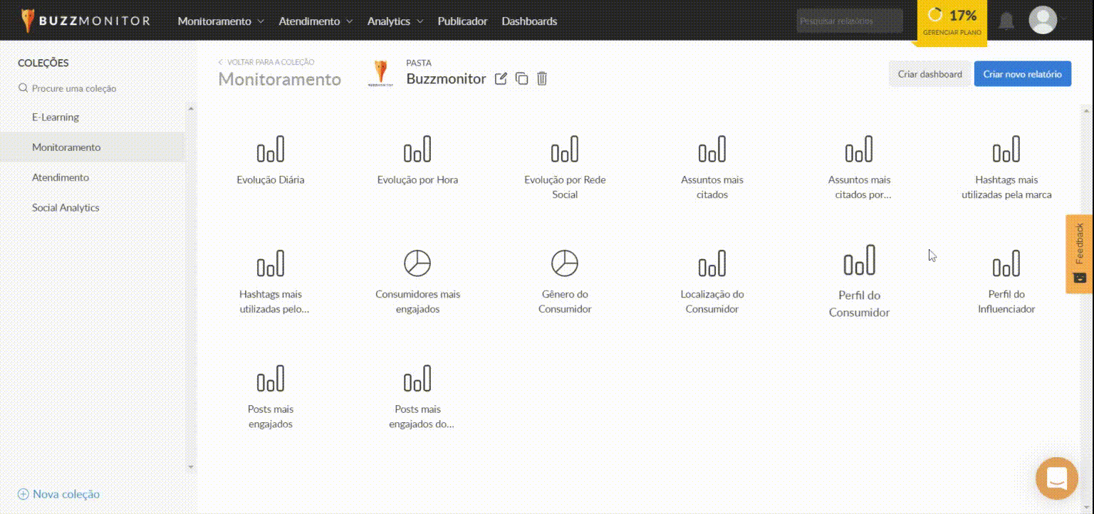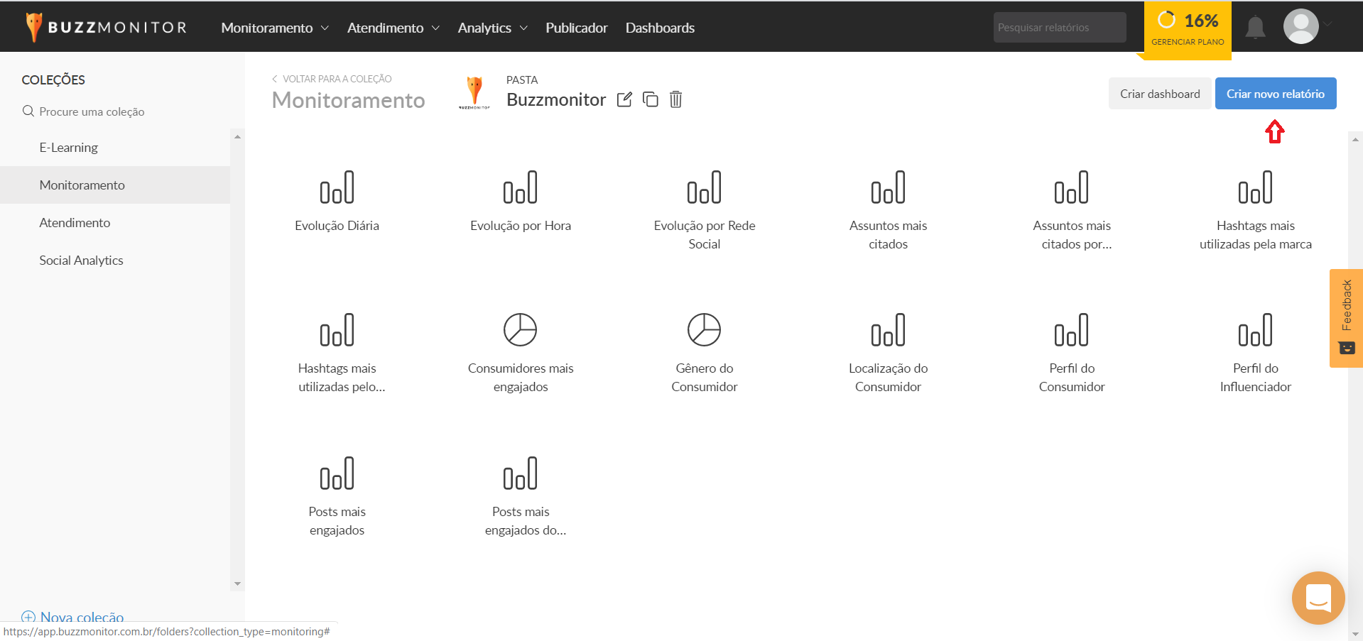 Para criar esse novo relatório, basta abrir sua pasta no Buzzmonitor e clicar no canto superior direito da tela em Criar novo relatório. Caso tenha dúvidas clique aqui e veja o nosso passo a passo.