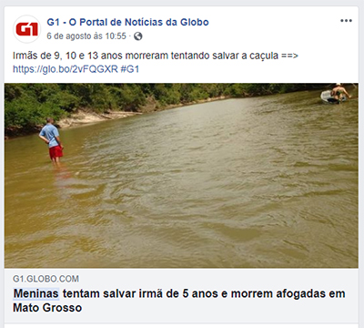 “Três crianças, de 9, 10 e 13 anos, morreram afogadas no Rio São João nesse domingo (5), em Nova Bandeirantes, a 980 km de Cuiabá. De acordo com a Polícia Militar, a irmã caçula delas, de 5 anos, foi a primeira que se afogou. As três vítimas morreram afogadas tentaram salvá-la, mas morreram afogadas.” Que elas descansem em paz :/