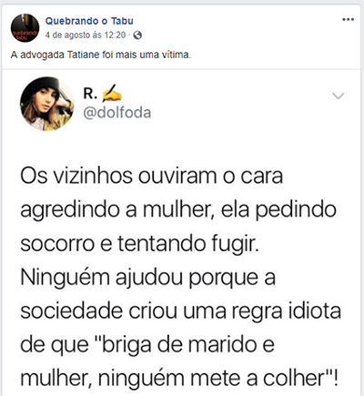 Mais uma notícia em destaque sobre o caso da advogada Tatiane. É preciso acabar com essa ideia de que não se deve “meter a colher” em briga de marido e mulher. Tem que meter sim e evitar que mais casos como esse aconteçam.