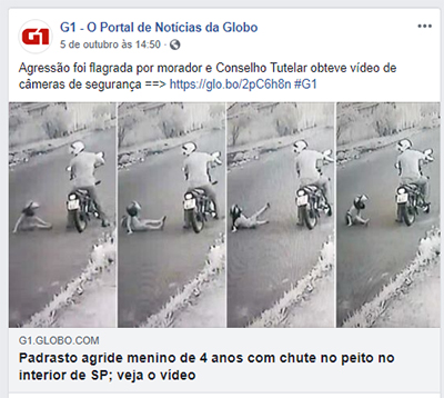 “Um jovem de 22 anos é suspeito de agredir o enteado, de 4 anos, no meio da rua em Sertãozinho (SP). Um morador flagrou a agressão e denunciou o caso ao Conselho Tutelar, que obteve imagens da câmera de segurança de uma casa que mostram os maus-tratos.”