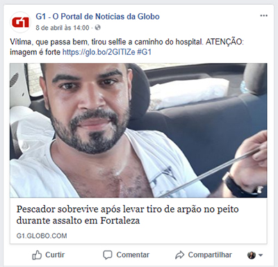 “Um pescador foi assaltado e sofreu um tiro do arpão que ele usava para pescar no Bairro Sabiaguaba, em Fortaleza, na sexta-feira (6). Bruno foi ferido no peito após reagir ao crime. O arpão atravessou a pele e torceu quando atingiu o esterno, osso do tórax. O metal foi removido em hospital particular no mesmo dia em que foi ferido; o mergulhador passa bem e já recebeu alta.”