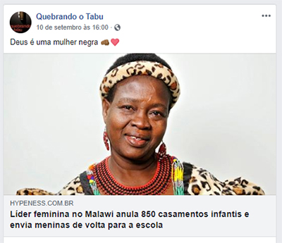 “Theresa Kachindamoto, supervisora de um distrito em Malawi, país da África, se destaca como uma líder feminista ajudando mulheres e garotas de sua comunidade. Até 2016, ela já havia anulado mais de 850 casamentos forçados, colocado meninas na escola e começado uma luta para abolir rituais que iniciam crianças sexualmente.”