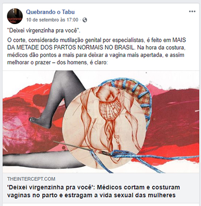 “O corte abaixo da vagina durante o parto se chama episiotomia e serviria para evitar que a passagem da criança causasse um rasgo entre a vagina e o ânus. É uma prática corriqueira no Brasil, onde 53,5% dos partos normais são feitos com episiotomia. Mas há três problemas com o corte: não há evidências científicas de que ele seja necessário, ele não pode ser feito sem autorização das mulheres e a costura em hipótese alguma deveria se estender além do necessário, muito menos com objetivo de apertar vaginas e satisfazer homens.”