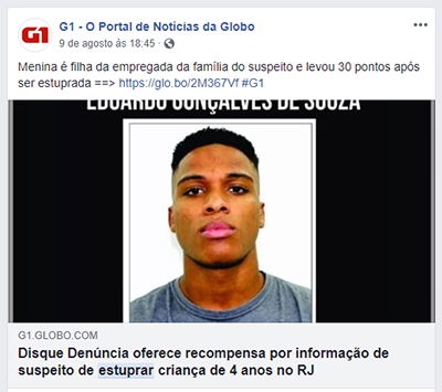 “O Portal dos Procurados divulgou nesta quinta-feira (8) um cartaz com recompensa de R$ 1 mil por informações que levem à prisão de Eduardo Gonçalves de Souza, de 19 anos. Segundo familiares, ele confessou o estupro de uma criança de 4 anos. Eduardo é considerado foragido da Justiça.” Nada mais justo.