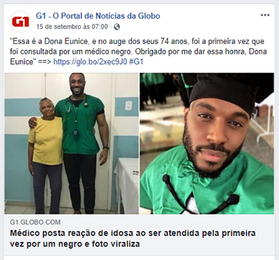 Dona Eunice, a senhora da foto, tem 74 anos e nunca havia sido consultada por um negro. O médico, Dr. Fred William Nicácio, de 31 anos, decidiu compartilhar o caso nas redes sociais para provocar uma reflexão sobre o número de médicos que são negros no Brasil.