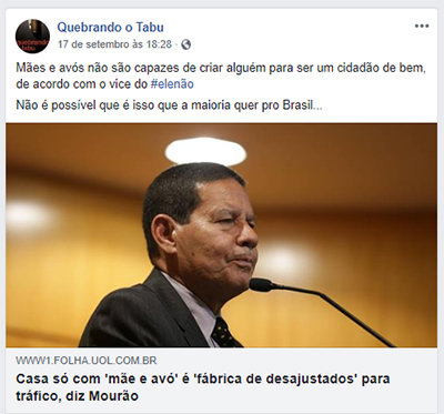 “O general da reserva Hamilton Mourão (PRTB), vice na chapa de Jair Bolsonaro (PSL) à Presidência, afirmou nesta segunda (17) que famílias pobres ‘sem pai e avô, mas com mãe e avó’ são ‘fábricas de desajustados’ que fornecem mão de obra ao narcotráfico.
