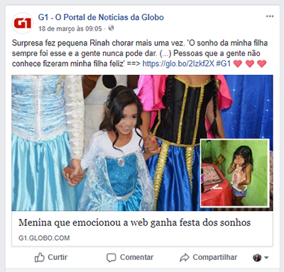 A notícia de que Rinah havia chorado em sua primeira festa de aniversário aos 7 anos repercutiu por toda a internet (inclusive foi a notícia mais curtida da semana passada). Um grupo de microempresários viu a notícia e resolveu dar à Rinah uma verdadeira festa dos sonhos, o que fez a menina se emocionar mais uma vez. <3
