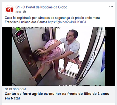 “Câmeras de segurança flagraram o momento em que Francisco Luciano dos Santos, vocalista da banda Brilhantes do Forró, agrediu a ex-esposa na frente do filho de 6 anos, nesta segunda-feira (20), em Natal. As imagens mostram as agressões no corredor e no elevador do condomínio onde mora o cantor e sanfoneiro.”