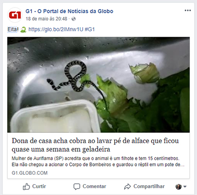 “Dona de casa acha cobra ao lavar pé de alface que ficou quase uma semana em geladeira”