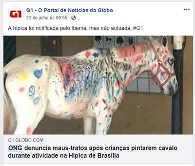 “Crianças que participavam de uma colônia de férias na Sociedade Hípica de Brasília, na última semana, foram autorizadas pelos monitores a usar tintas e canetinhas para “rabiscar” um dos cavalos do espaço. A atividade, considerada pedagógica pela hípica, é vista por ONGs de direitos dos animais como maus-tratos.”