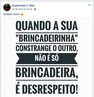 “Quando a sua ‘brincadeirinha’ constrange o outro, não é só brincadeira, é desrespeito!”