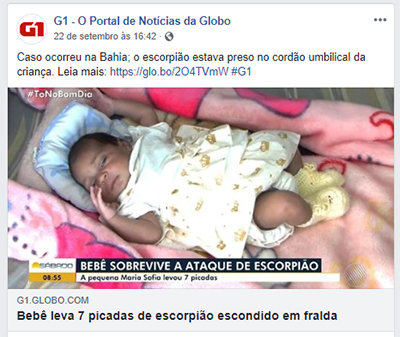 “O escorpião estava preso no cordão umbilical da criança, escondido dentro da fralda.” Tadinha! Mas após passar três dias na UTI ela teve alta e já está em casa.