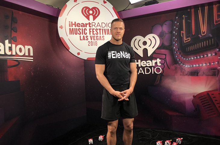 Dan Reynolds, vocalista do Imagine Dragons, foi ao iHeart Festival com uma camiseta com a hashtag #EleNão. Assim como Reynolds, outros artistas internacionais também se posicionaram sobre o presidenciável Jair Bolsonaro.