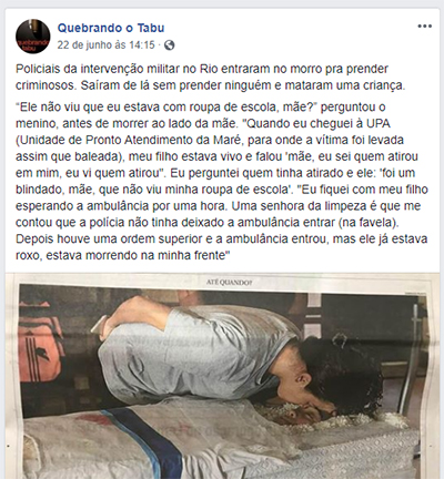 “Policiais da intervenção militar no Rio entraram no morro pra prender criminosos. Saíram de lá sem prender ninguém e mataram uma criança.” Marcos Vinicius tinha 14 anos e foi baleado indo para a escola na última quarta-feira (20). Que ele descanse em paz e a justiça seja feita.