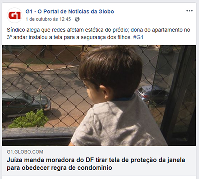 E “no processo, a empresária Mairá Campos diz que quer evitar a queda de três crianças e três cachorros do terceiro andar. Já o síndico afirma que o condomínio proíbe esse tipo de estrutura porque afeta a estética do prédio, na 410 Sul, região tombada da capital.”