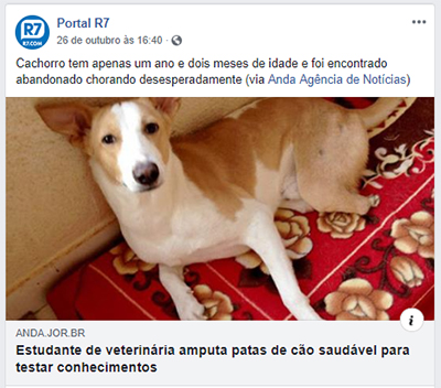 “Em Goa, na Índia, um estudante de medicina veterinária amputou as patas traseiras de um cachorro para praticar com ele como se fosse seu paciente. Prince tem apenas um ano e dois meses de idade e foi encontrado em um campo chorando desesperadamente. O cão estava enrolado debaixo de uma árvore.”