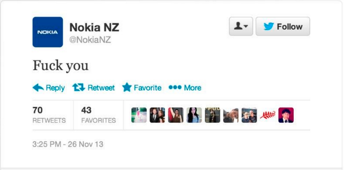 O perfil da Nokia da Nova Zelândia publicou a frase “Fuck you” no Twitter e causou um grande rebuliço na rede social. A marca pediu desculpas, mas nunca explicou como a mensagem foi parar no microblog.