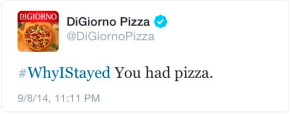 A pizzaria norte-americana DiGiorno utilizou a hashtag #WhyIStayed para fazer uma brincadeira, quando o intuito da ação era um assunto muito sério: apoiar mulheres que sofreram violência doméstica.