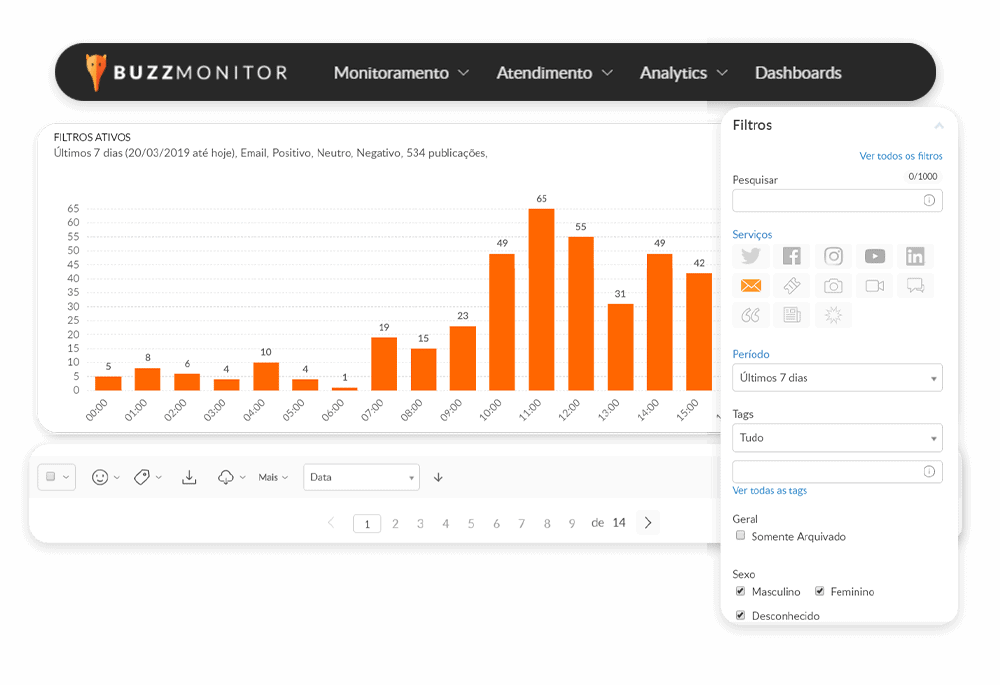 Na Buzzmonitor você classifica e organiza suas informações em poucos cliques e também conta com 15 relatórios pré-configurados criados automaticamente ao cadastrar uma nova marca na plataforma.