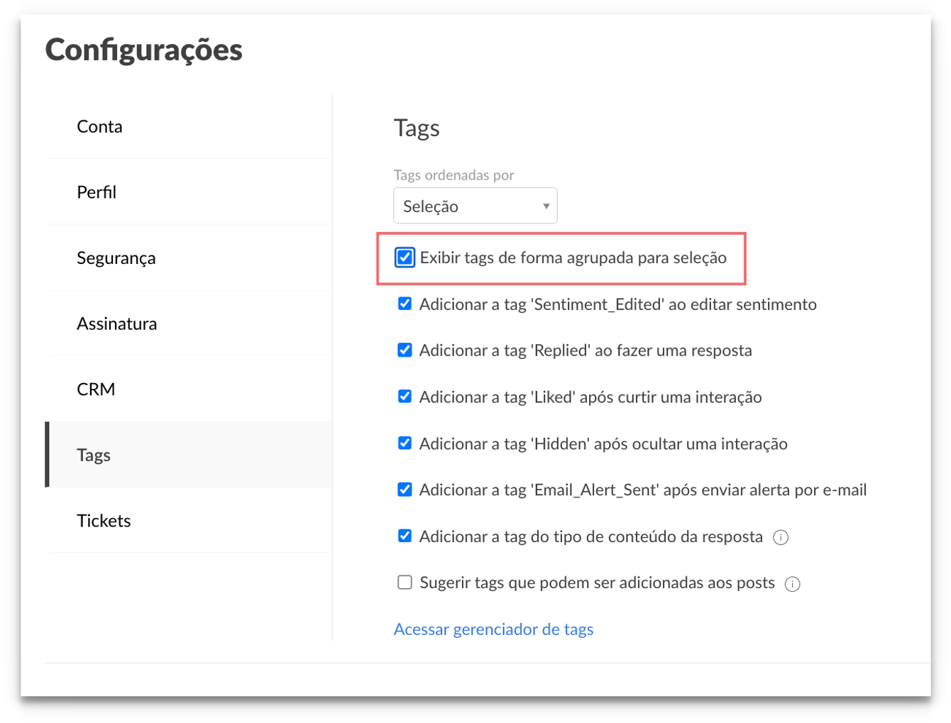 Foi adicionada uma nova opção na aba Tags das configurações da conta que permite aos usuários definir o estado da lista de tags que podem ser aplicadas nas interações. Caso ativada, as tags serão exibidas de forma agrupada automaticamente.