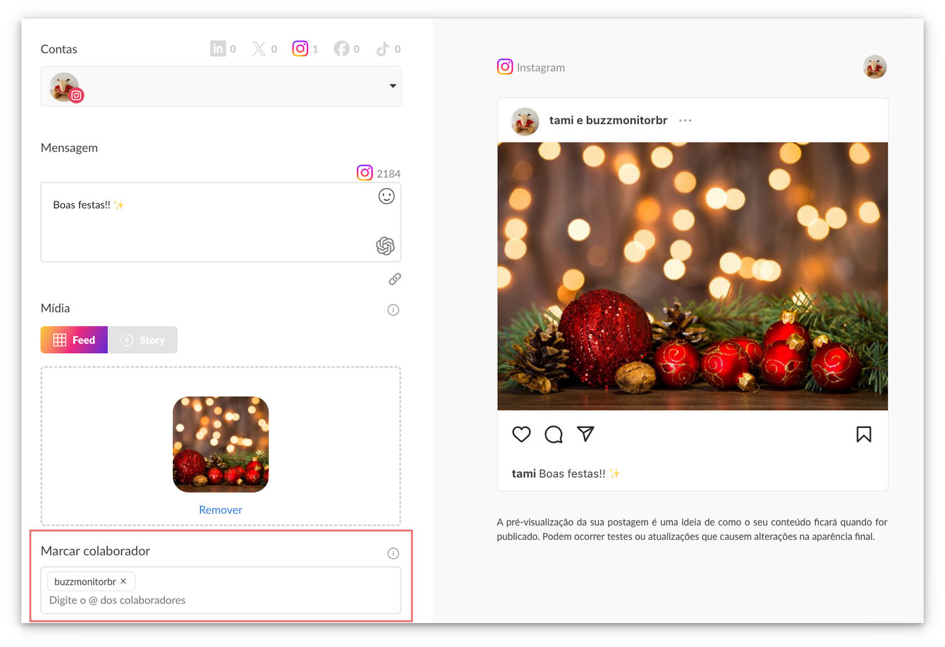 Agora é possível criar agendamentos de publicações no Instagram de forma colaborativa. Ao utilizar a opção “Marcar colaborador”, você pode adicionar até três perfis para colaborar na criação da publicação, tornando a gestão de conteúdo colaborativo mais fácil e possibilitando uma maior eficiência e coordenação entre diferentes colaboradores.