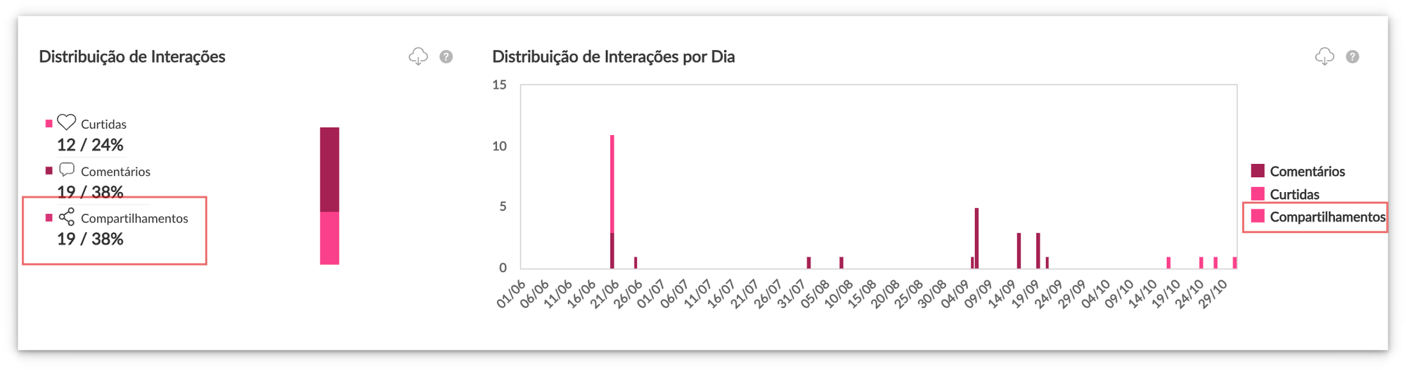 Compartilhamentos nos Gráficos de Distribuição de Interação: Os gráficos de distribuição de interação na aba de Engajamento, agora exibem informações sobre compartilhamentos.