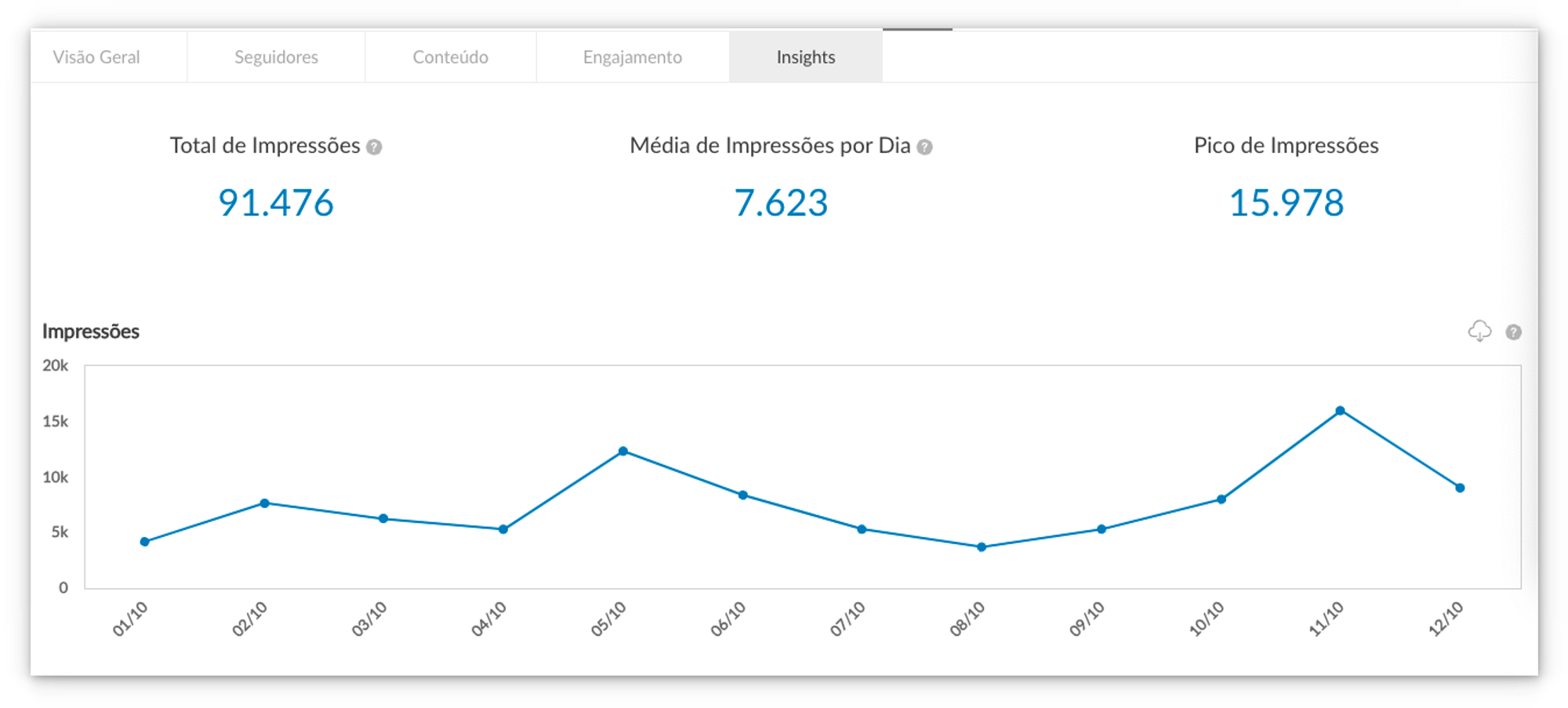 Agora, no Analytics Pro para contas de LinkedIn, introduzimos a aba de Insights, que engloba o gráfico de impressões já existente e adiciona as métricas de Total de Impressões e Média de Impressões.