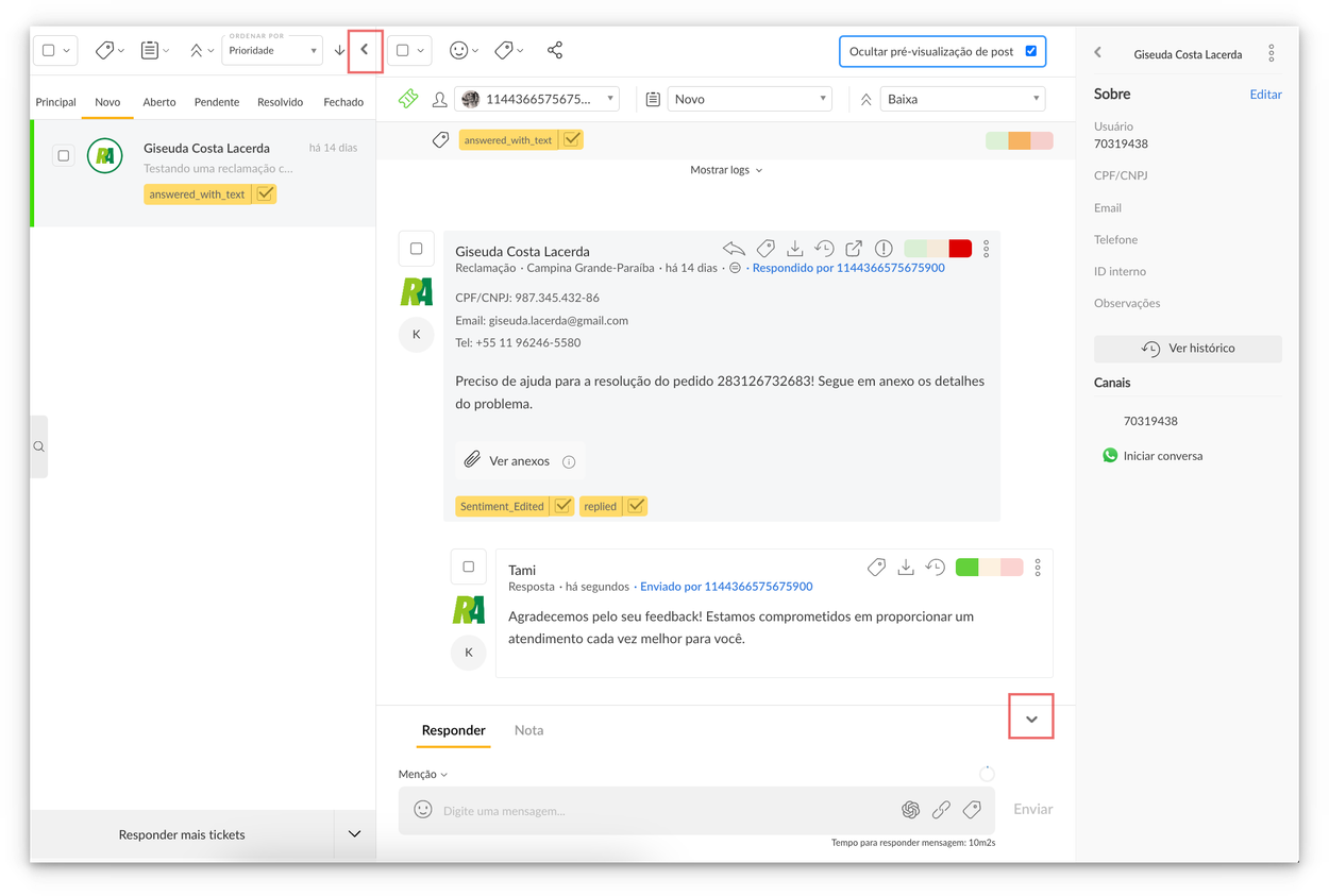 • Agora, os usuários têm a capacidade de esconder menus que eram previamente fixos na página de tickets. Essa flexibilidade permite uma maior personalização da tela, adaptando-a às preferências individuais e às necessidades específicas de cada dispositivo.