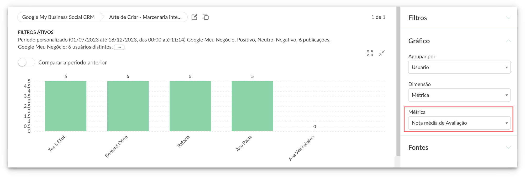 Agora, você tem a opção de configurar os gráficos nos relatórios de monitoramento para exibir a métrica “Nota Média de Avaliação”, relacionada às avaliações de empresas no Google Meu Negócio. Essa inclusão proporciona uma visão imediata sobre a qualidade geral das avaliações, tornando mais fácil compreender o feedback dos clientes.