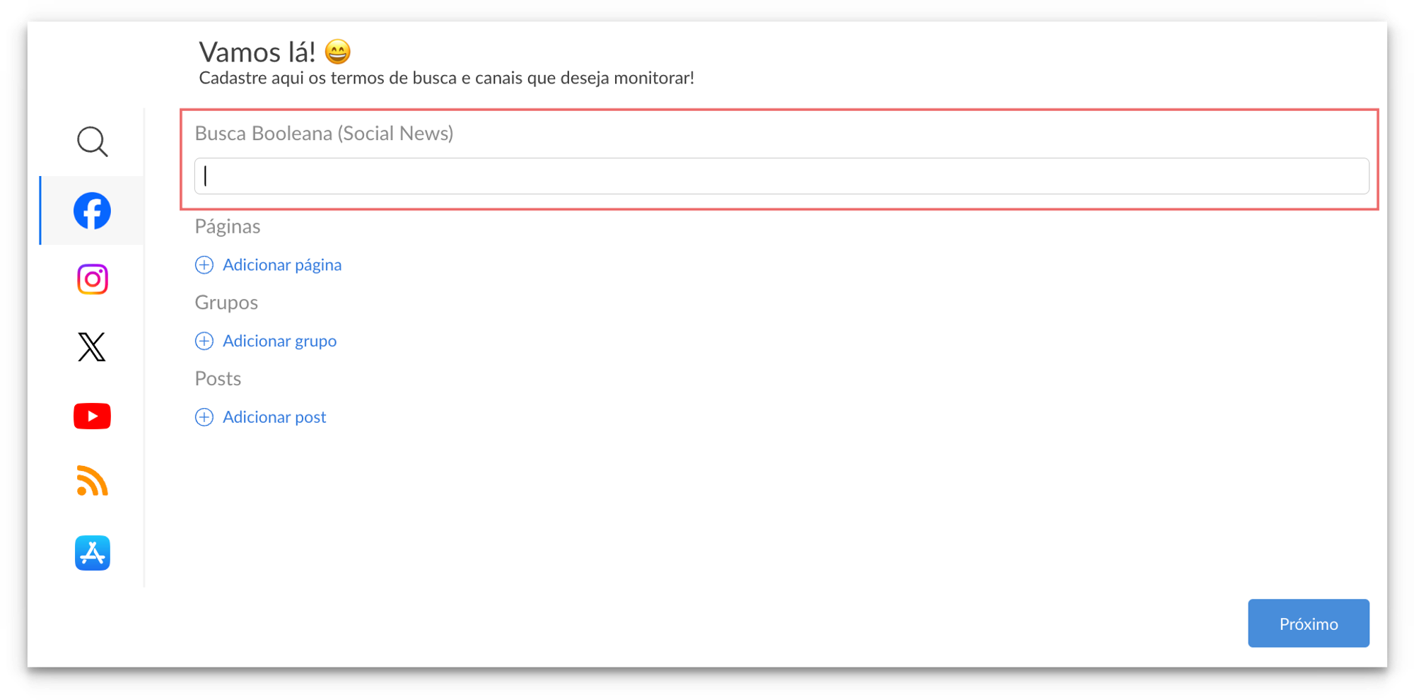 Agora, ao configurar um projeto, os usuários podem definir termos de busca exclusivos para Facebook (Social News), Twitter e RSS, proporcionando uma personalização mais refinada e eficiente das buscas.