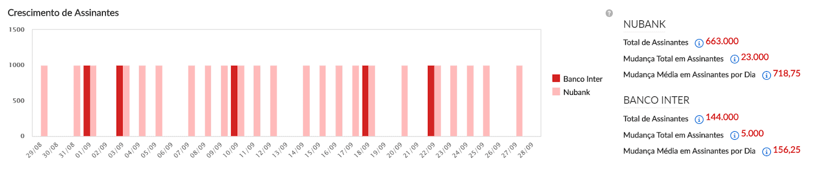 Fig.1: Dados de Crescimento de assinantes dos dois bancos entre os dias 29/08 até 28/09.