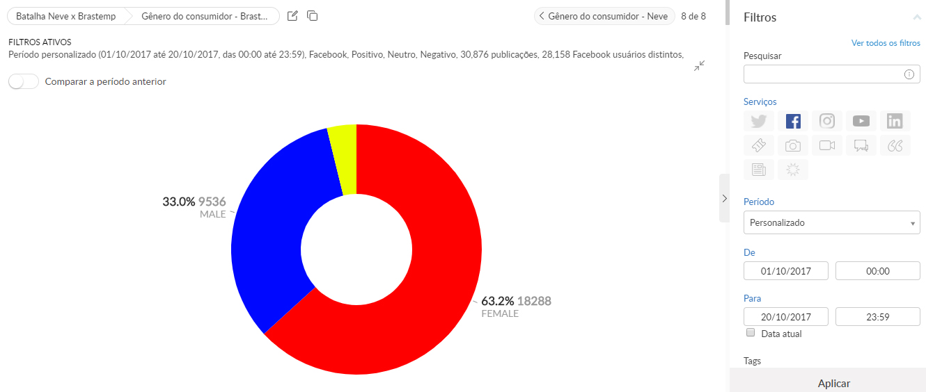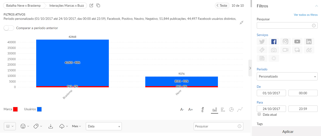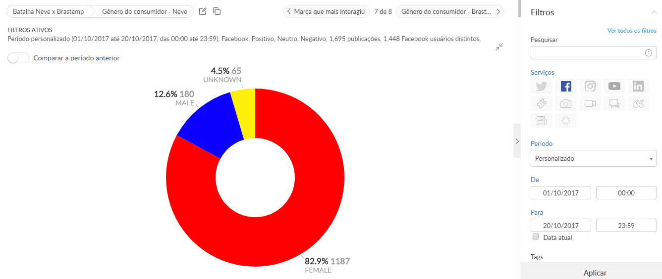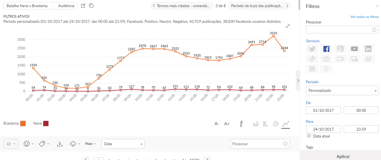 Esses números demonstram que cada marca teve engajamento em horários distintos. Uma hipótese é que a veiculação da campanha da Brastemp na TV no horário noturno fez com que o engajamento neste horário se repetisse no Facebook.