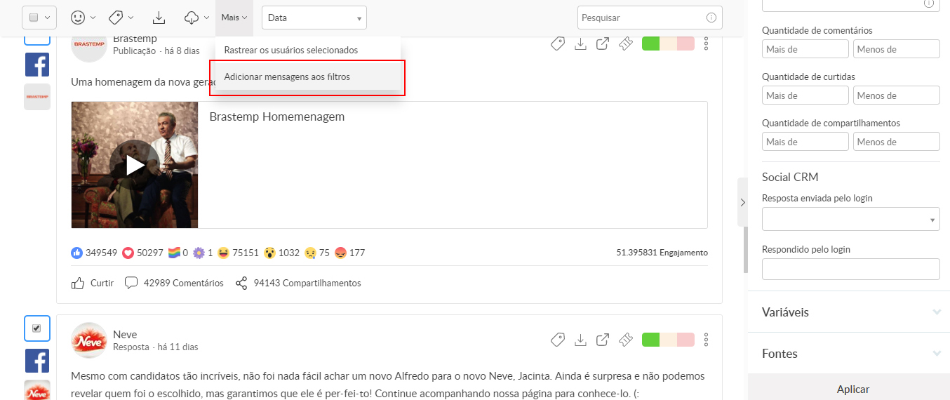 3. Agora as duas publicações aparecerão isoladas na parte inferior do relatório. Selecione-as e aplique a opção “Adicionar mensagens aos filtros”. Depois selecione a opção “Sim” na mensagem que surgir em sua tela e pronto! As publicações estarão isoladas e filtradas, ou seja, tudo o que você monitorar será apenas dos posts patrocinados.