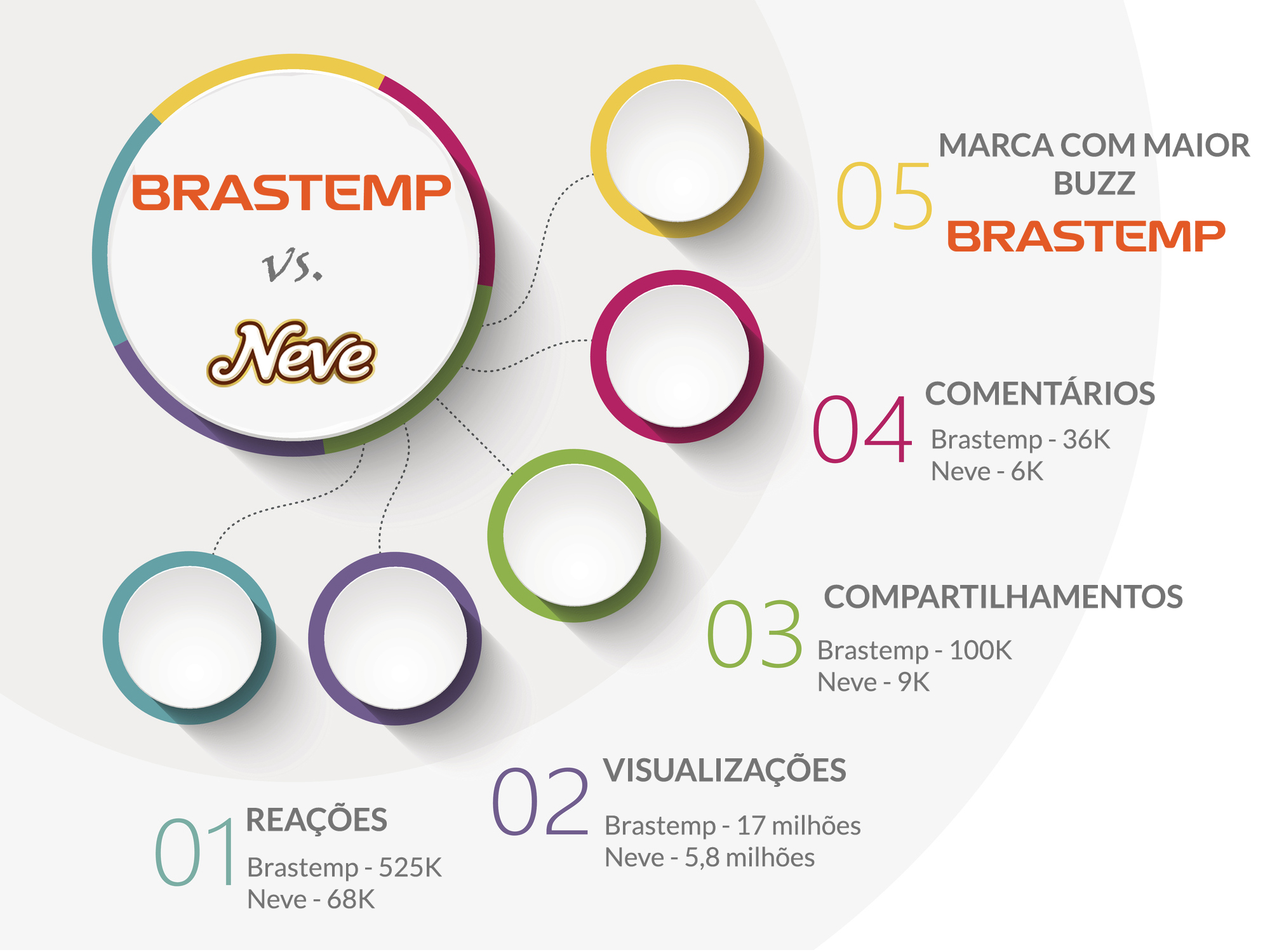 Brastemp fica na frente em relação à quantidade de buzz recebido: ao todo, somadas as interações da marca e os comentários dos usuários, durante o período foram feitas 42.468 interações. Neve fica com 9.376 interações, porém tem uma taxa de resposta aos comentários maior do que a Brastemp: Neve respondeu 9% dos comentários, enquanto Brastemp respondeu apenas 2%.