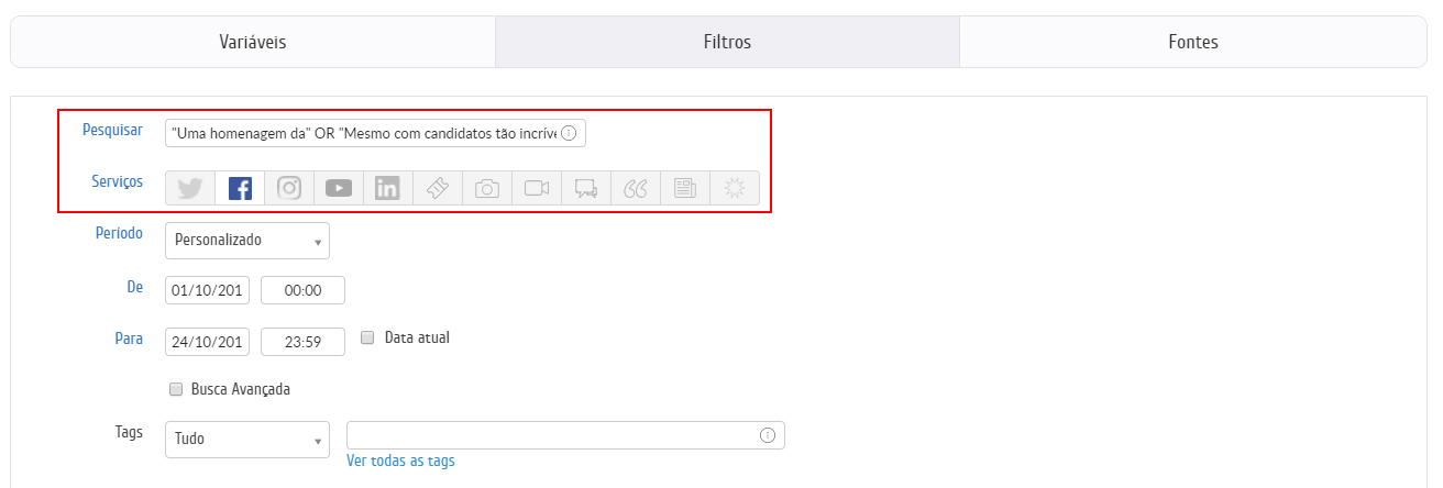 2. Na parte de Filtros insira no campo de pesquisa trechos de ambas as publicações entre aspas e com o termo booleano OR entre elas. Ex: “Uma homenagem da” OR “Mesmo com candidatos tão incríveis”. Lembre-se de deixar ativo apenas o serviço de Facebook e na parte Fontes apenas as marcas que você está monitorando.