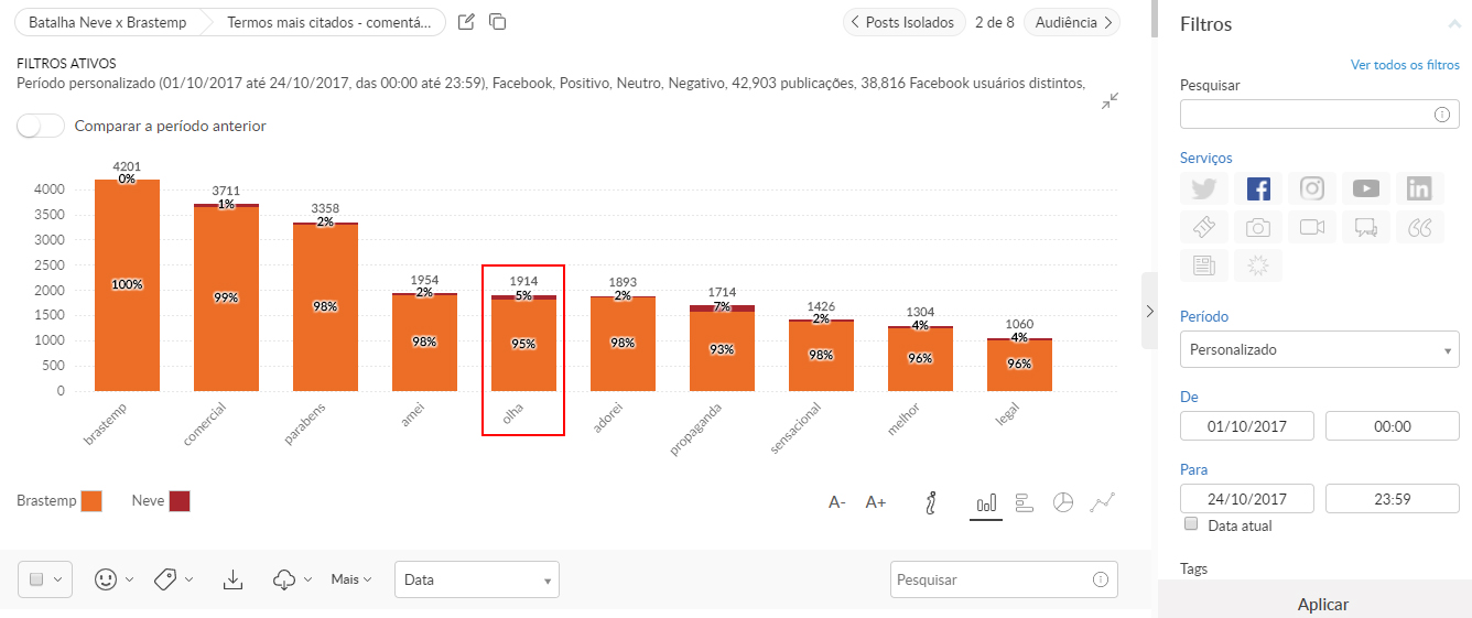 Monitorando os comentários dos posts impulsionados de ambas as campanhas no Facebook, percebemos que a publicação da Brastemp obteve maior número de comentários, geralmente com mais de 90% de todos os comentários gerados pelas duas campanhas. Entre os destaques, o termo “olha”, presente nos comentários de ambas as marcas. Brastemp fica com 95% dos comentários “Olha”, enquanto a Neve fica com apenas 5%.