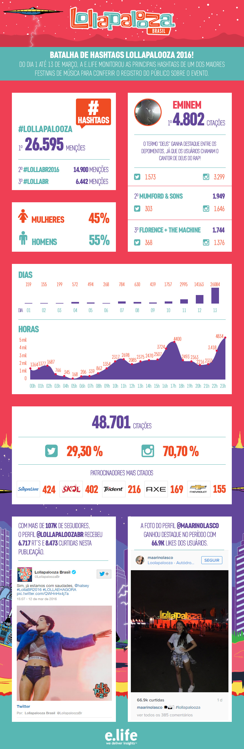 Do dia 1º de março até o encerramento dos shows no dia 13, a E.Life monitorou as principais hashtags sobre o festival para saber quais foram as impressões do público nas redes sociais sobre as atrações.