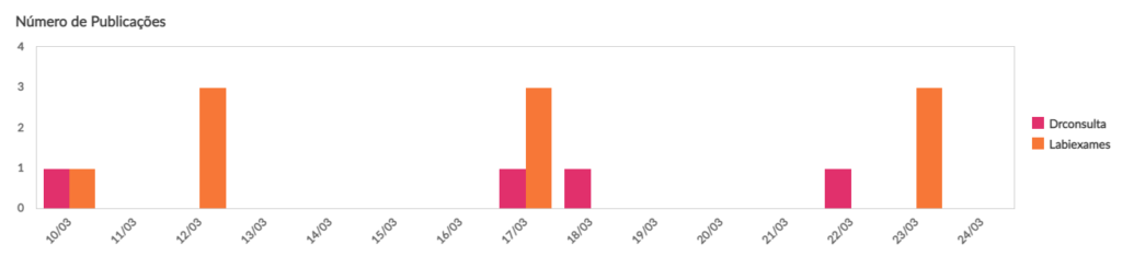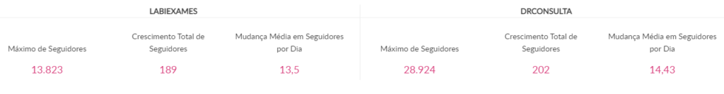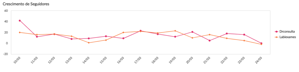 Em relação ao número máximo de seguidores durante os 14 dias analisados (10 a 23 de março), a Labi Exames atingiu a marca de 13.823 seguidores no Instagram. Já o Dr.Consulta finalizou o mesmo período com 28.924.