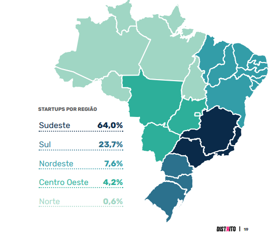 De acordo com um estudo feito pelo Distrito em 2020, a região Sudeste do Brasil concentra mais de 60% das healthtechs. Em seguida vem a região Sul, com 23,7% delas, a região Nordeste com 7,6%, a região Centro Oeste com 4,2% e por último a região Norte com 0,6% de presença das startups.