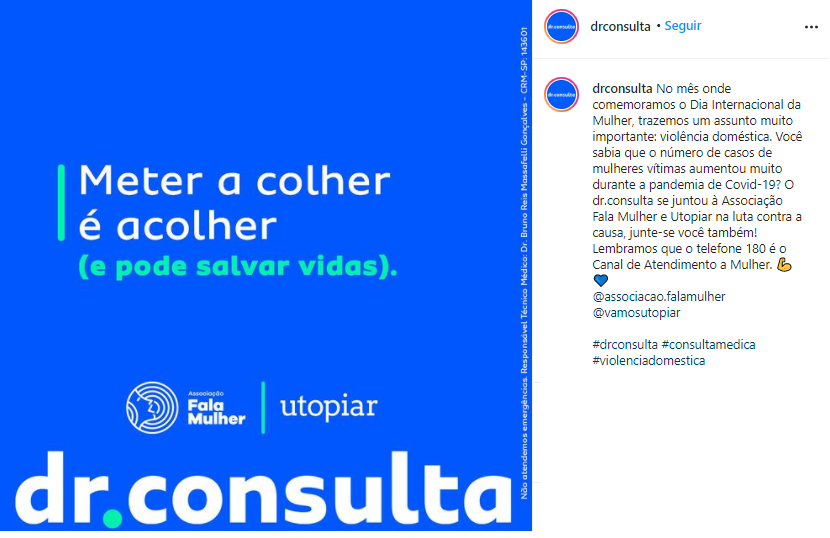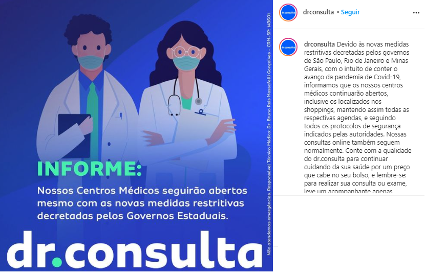 Post 2 – Nessa publicação, o Dr Consulta divulgou a continuidade dos seus serviços, mesmo diante das medidas restritivas do governo em relação ao COVID-19.