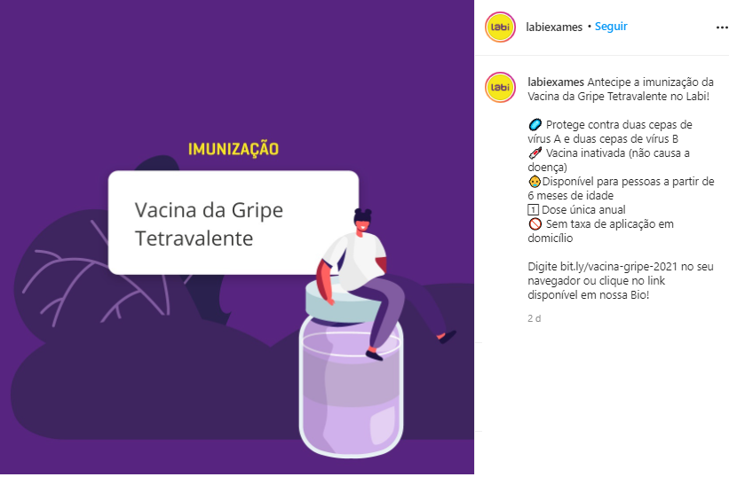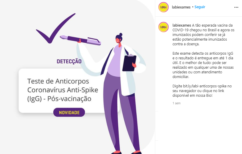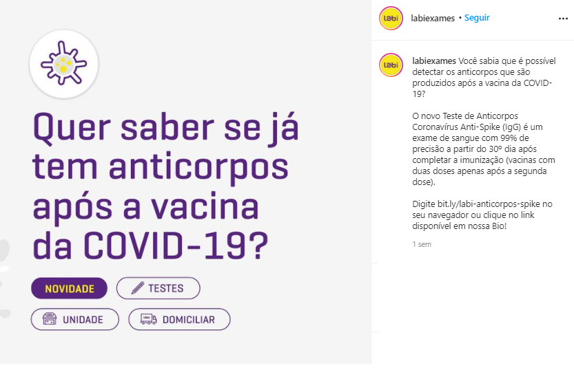 Assim como vimos no caso da Dr.Consulta, a Labi Exames também conta com uma identidade visual. As cores usadas pela healthtech são o roxo, branco e amarelo. Ter uma identidade visual faz o usuário lembrar da sua marca só de ver um post característico.