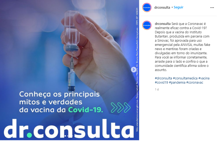 Post 3 – Esse post é relacionado a um momento importante que estamos vivendo, que é a etapa de vacinação contra a COVID-19. Com 50 interações, a publicação em formato carrossel expôs mitos e verdades da vacina CoronaVac (aprovada pela ANVISA).